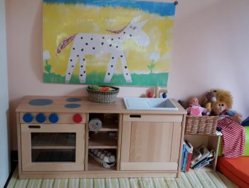 Bei ihr zu Hause hat sie für uns alles liebevoll gestaltet. Es gibt viele tolle Spielbereiche – drinnen u.a. eine Spielküche, eine Kuschelecke, eine Rutsche aus Holz und eine Malwand. Im Hof haben wir im Sommer viel im Wasser geplanscht.