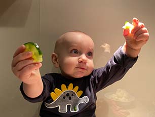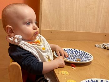 Mit der Eingewöhnung haben wir bereits begonnen als Johannes 9 Monate alt war. Für mich als Mama war das schon etwas früh, aber im Nachhinein stellte sich dies als völlig unbegründet heraus. Johannes war anfangs gemeinsam mit mir da und schnell gewöhnte er sich an Frau Biskin, so dass er auch schon nach einigen Tagen für eine kurze Zeit bei ihr alleine war. Nachdem dies gut funktionierte war Johannes schnell auch vormittags in der Gruppe für einige Stunden integriert. Zu diesem Zeitpunkt war er mit seinen neun Monaten mit Abstand der jüngste, doch alle anderen Kinder schauten nach ihm, nahmen Rücksicht, so dass Johannes schnell Teil der Gruppe wurde. Und viel schneller als gedacht war Johannes eingewöhnt und auch der Mittagsschlaf klappte besser als zu Hause. Nach einigen Nachmittagen und dann ungefähr 2 Wochen regelmäßig vormittags war die Eingewöhnung schon erfolgreich abgeschlossen und ich konnte beruhigt und guten Gewissens wieder arbeiten gehen, da sich Johannes in einer gut gehüteten Umgebung befand.